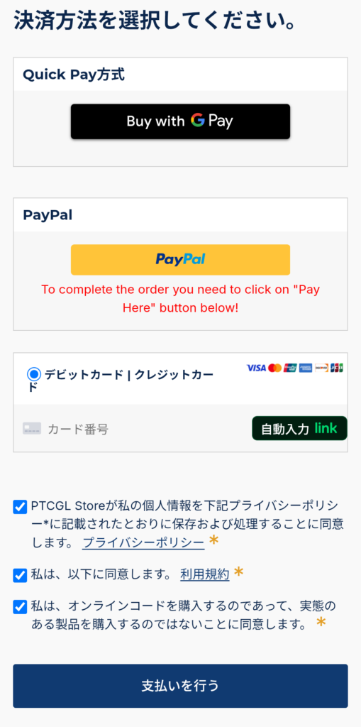 注文時は各項目にチェックマークを付けて「支払いを行う」をクリックします。