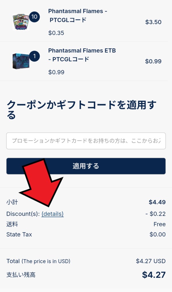 ショッピングカートに入っているアイテムの合計額と適用されているクーポンの値引き額が表示されます。