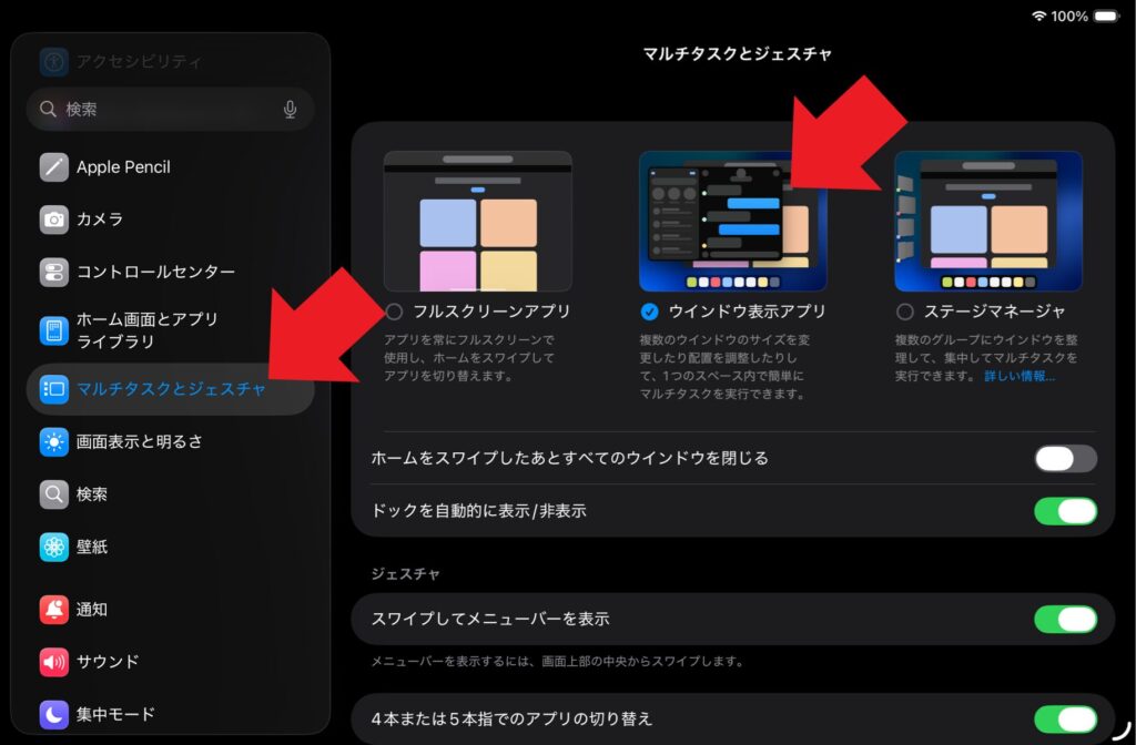 iPadで設定アプリを開き、「マルチタスクとジェスチャ」をタップしてから、「ウインドウ表示アプリ」を選択します。