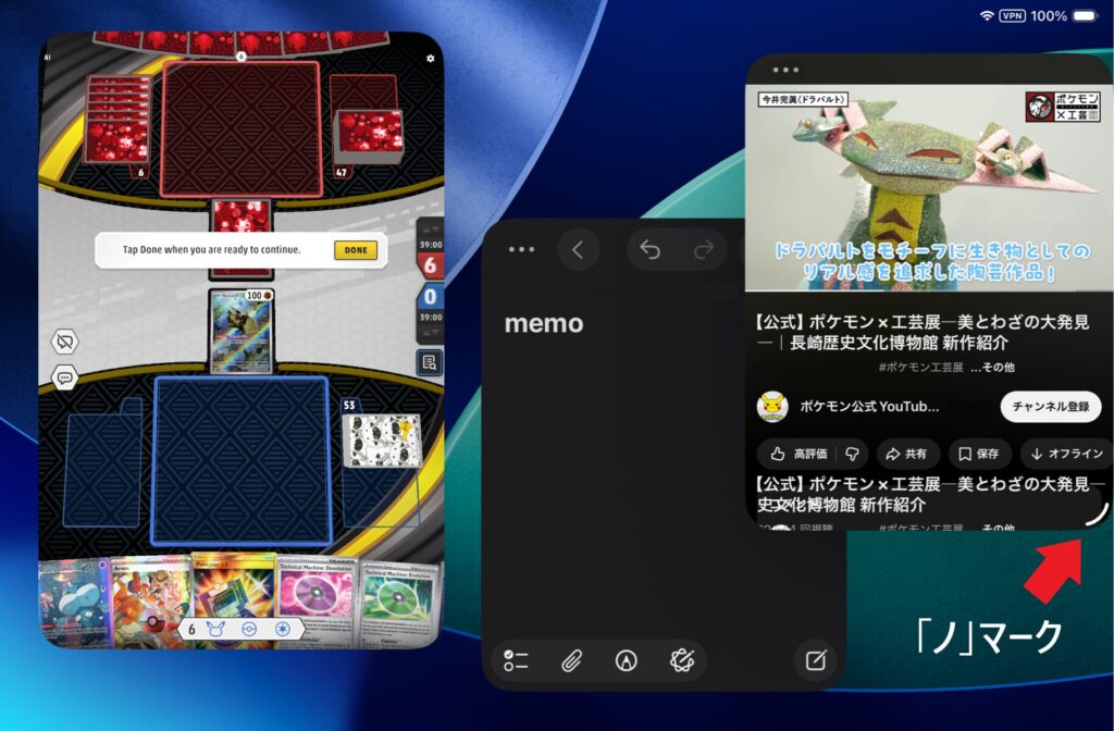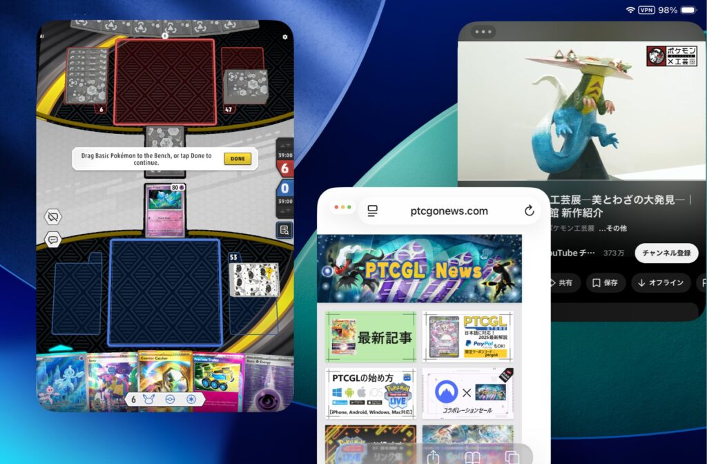 iPadOS 26からマルチタスク機能が強化され、PTCGLをプレイしながら様々なアプリを同時に使いやすくなりました。